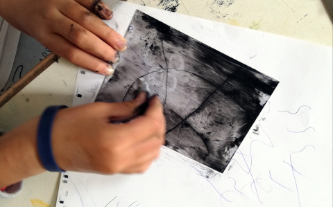 Es wird an der Druckerpresse mit Linolschnitt und Radierung gearbeitet sowie mit Zeichnungen, Klebe- und Bindetechniken experimentiert. Der Druckstock kann aus alten CDs, Linol, Plexiglas, Blättern aus dem Park oder Moosgummi hergestellt werden.
