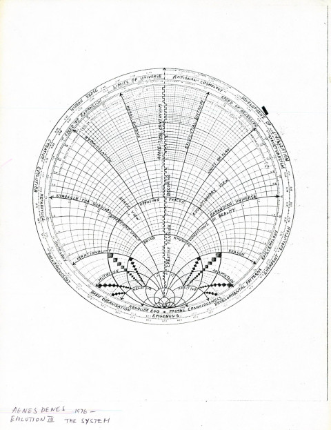 Agnes Denes ist Teil der Land- und Environmental Art. Sie erschuf riesige künstlerische Landschaften, deren formaler Ausgangspunkt die Mathematische Geometrie ist, die auch