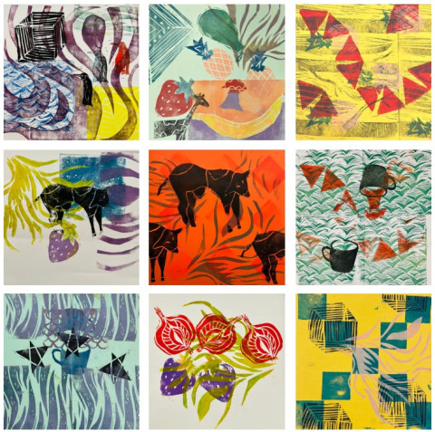Hierbei kann man verschiedene Drucktechniken wie Linoldruck, Monotypie oder Stempeldruck kennenlernen, aber auch Zeichnen, Schneiden und ein eigenes Poster gestalten. Das wird dann ein Teil des Mosaiks.
